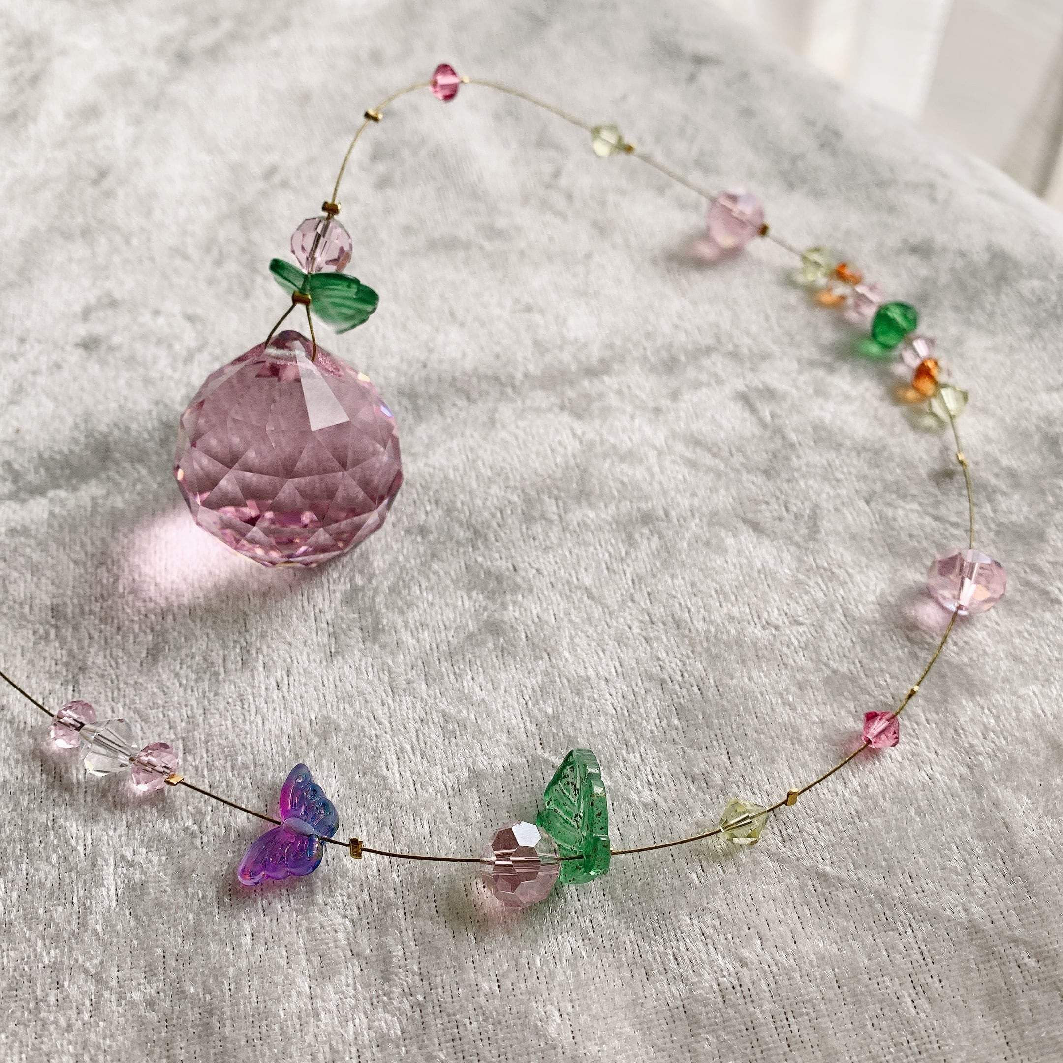サンキャッチャーは、窓辺やテラスで日光を浴びると、きらめく虹の輝きがお部屋を彩り、幸せな気持ちを届けてくれます。あなたの大切な願いを胸に、毎日を前向きに過ごすきっかけになってくれます。 日々の暮らしに優しい幸せを届けるために、ぜひお部屋にお迎えください。日光が当たらないお家の方も、壁に飾っていただき、色を目にすることで、そのエネルギーを受け取ることができますので、効果は十分に感じていただけると思います。